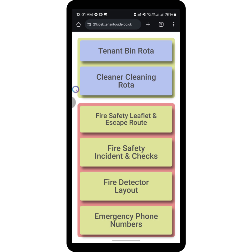Your tenants can use our Tenant Guide app and website, customised to your property, that outlines the House Rules*, the property’s safety information, and allows them to report any kind of problem. *I have developed a comprehensive series of House Rules that have stood the test of time, that can be customised to the standards of behaviour your tenants sign up to.